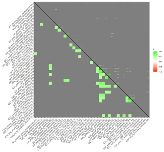 Figure 6 shows the correlation between all the questions that have more than 0.5 of correlation factor. All the questions are shown here, and most of the correlations are near the diagonal, which means the questions are related to the previous one.