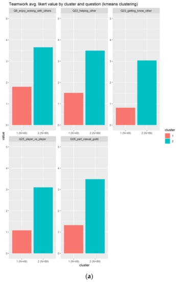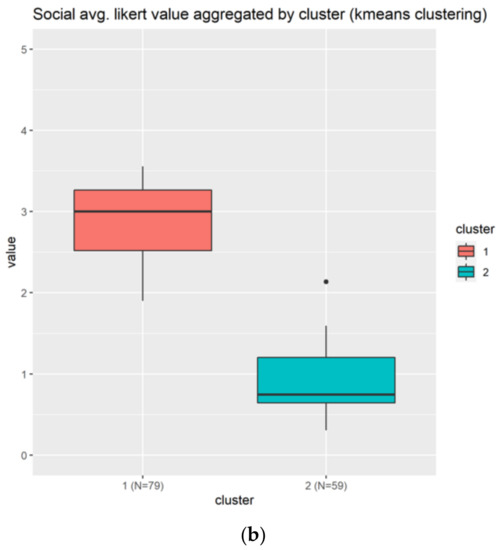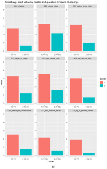 Figure 8 shows only two clusters, being the bigger one (N = 79) the most positive across the nine questions. As indicated in Figure 8a, the cluster 1 agrees slightly with the use of social elements, meanwhile the cluster 2 in blue totally disagrees (the value is between 0–1). This can indicate either that the social elements are not well represented in our form, or the individuals does not like the social elements, on average.