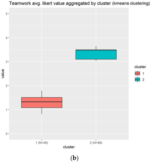 Teamwork generated two clusters, as indicated in Figure 7. Figure 7a, indicates clearly positive feedback (scores bigger than three) across all the questions by the individuals at the cluster two, in blue. The cluster one replies negative to the teamwork elements, because the average score is less than 2. Figure 7b indicates, in terms of boxplots, the results. The blue boxplot of the cluster two indicates that the median score is almost the third quartile (Q3), which indicates that there is less variation in terms of the score from the users that replied almost 4, than the users that replied between 3 and 3.5, which indicate very positive feedback to use teamwork elements. Cluster one has no particular characteristics, rather confirming the disagreement of the individuals inside this group to use teamwork elements. In general, more individuals agreed to use teamwork elements than disagreed (89 vs. 49).