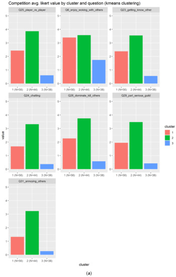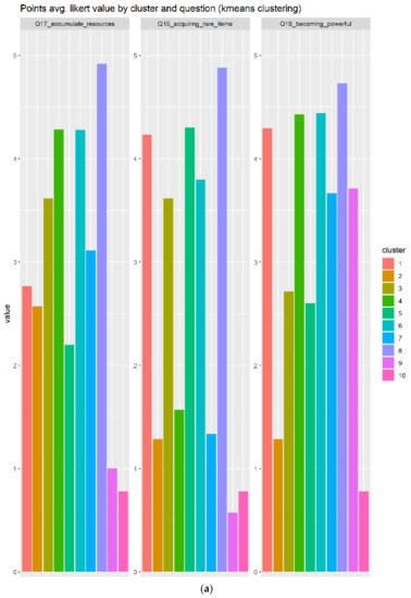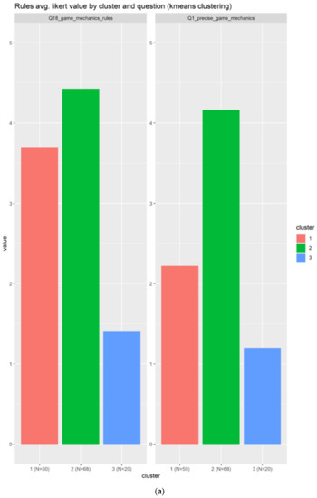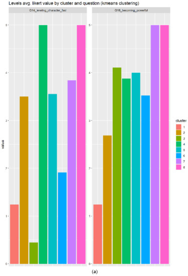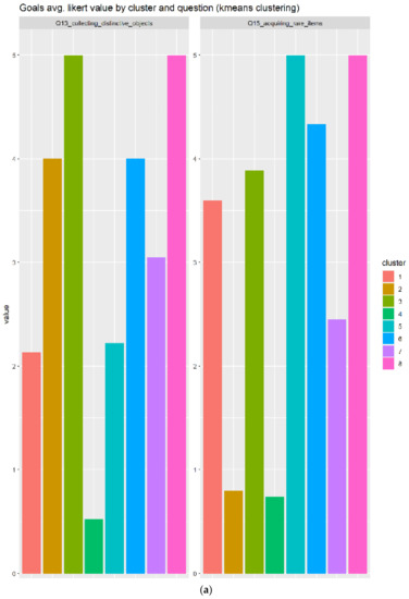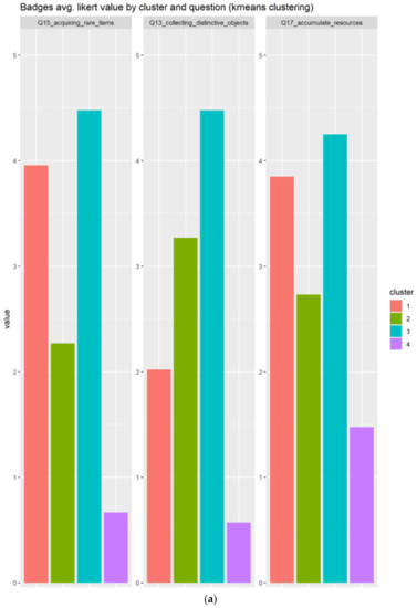 As depicted in Figure 16a, we can see that cluster 1 and 3 responds very positively to acquiring rare items and accumulate resources, but only cluster 3 very positively evaluates the collection of distinctive objects. Next, we can determine that the cluster 3 will be the best candidate for users with a profile compatible with badges.