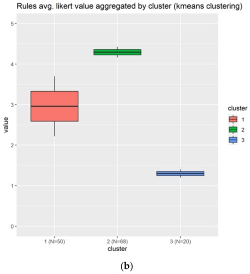 In this case (see Figure 9) we have three clusters in red (1), green (2), and blue (3), being the first two well balanced in number of individuals and the last cluster being the smallest one with 20 individuals. Both cluster 1 and 2 are good candidates to represent the rules elements, the second cluster in green being the best candidate with higher scores across the two questions as shown in Figure 9a and also more concentrated boxplot as indicated in Figure 9b.
