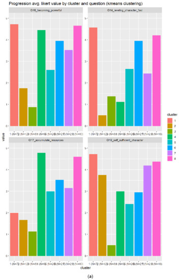 Figure 14 indicates a total of eight clusters, where three of those responded positively to the leveling elements, meanwhile the other elements remain neutral (almost 3 in average), except one (cluster 1) which responded negatively to the leveling elements. Figure 14b shows three clusters as the best candidates (4, 7, and 8), but the cluster eighth is the most optimal, because it has the smallest IQR and the highest average score.