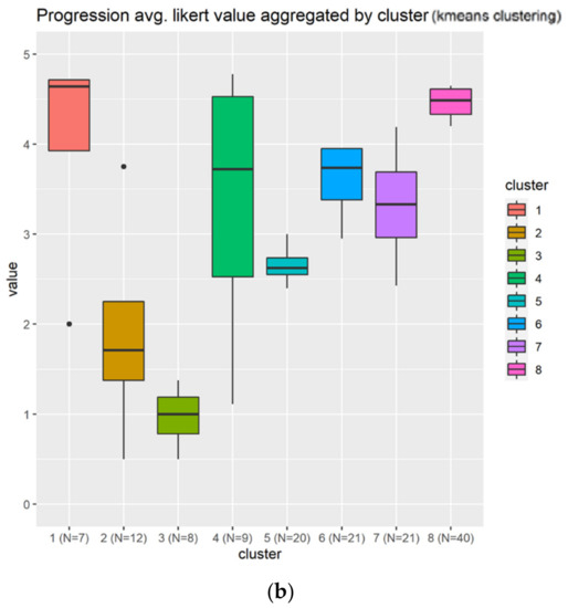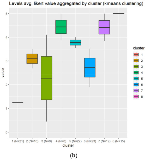 This time, eight clusters have been generated according to Figure 15a, which reveals that cluster 8 is the most appropriated group to associate with goals elements, as this contains the individuals that responded almost the highest possible score (5/5). The boxplot in Figure 15b confirms that, with one of the smallest IQR presented on the study. This cluster contains enough individuals (N = 15) to be considered as representative.