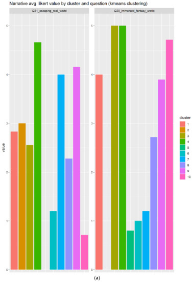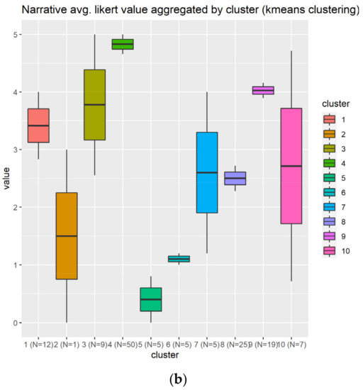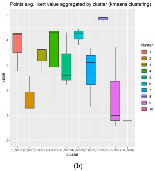 The narrative also generated a heterogeneity of opinions among the individuals that replied to our form. A total of 10 clusters have been generated, as indicated in Figure 12a, which shows that cluster 4 in green replied very positively to those questions. Additionally, the cluster 9 in light pink replied positively to the narrative elements’ questions. According to the Figure 12b, the best candidate is the cluster 4 in green, because it contains higher scores and a bigger number of individuals (N = 50) compared to the cluster 9 with slightly lower scores in average and smaller number of individuals (N = 19).