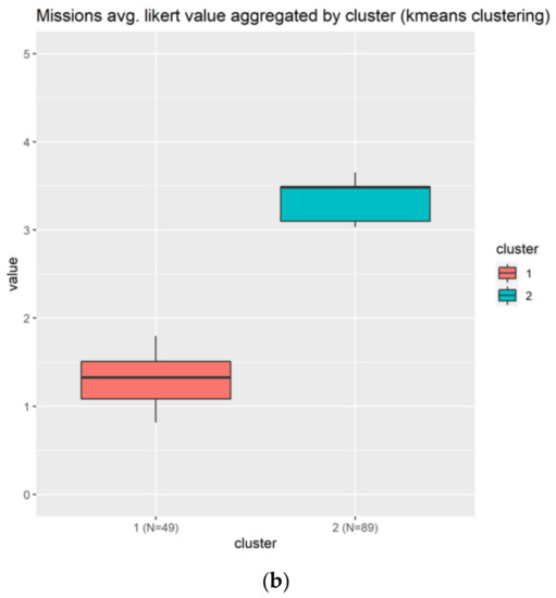 Results for the mission elements. Only two clusters are generated. The (a) subplots shows the results based on each question, meanwhile the (b) shows the information condensed in boxplots.