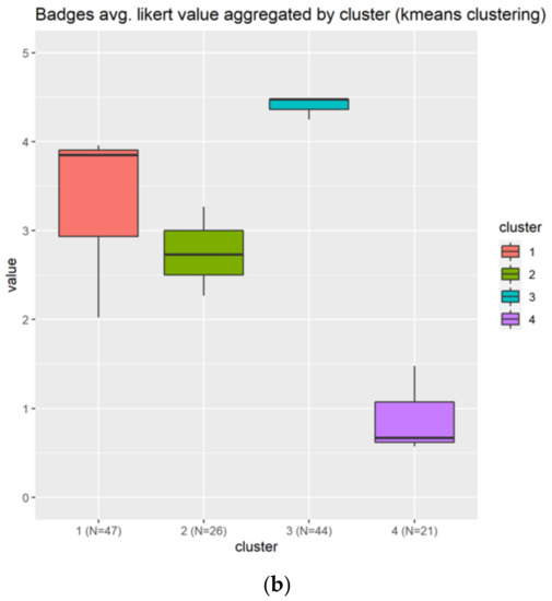 This figure shows the results for the Badges. Each color identifies a different cluster. The (a) subplots show the results based on each question, meanwhile the (b) shows the information condensed in boxplots.