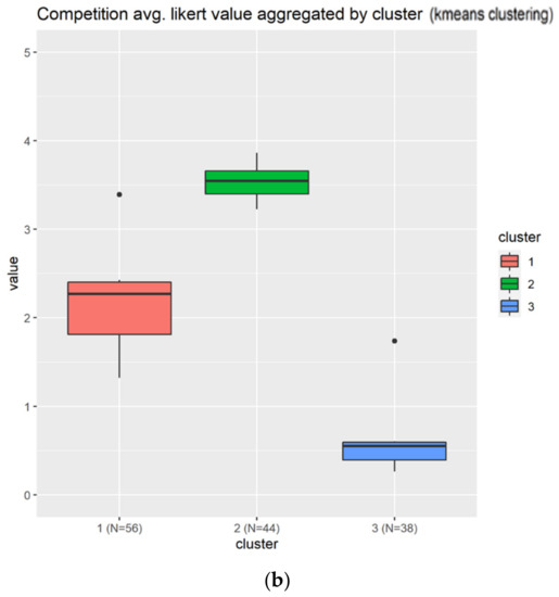 This figure shows the results for the Competition. There are three clusters in different colors. The (a) shows the results based on each question, meanwhile the (b) shows the information condensed in boxplots.