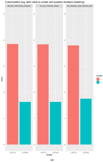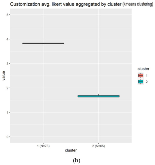 Customization is composed by only two clusters as indicated in Figure 18. Those clusters are almost the same size in terms of individuals, something that is good, because the groups are well balanced. The first group in red, cluster 1, is composed of those individuals that agree with the customization elements, as the average value in all the questions is almost 4/5, as can be seen in Figure 18a. The other cluster in blue is composed of those who slightly disagree with the customization’s elements. Figure 18b confirms that the cluster 1 agrees with a unanimous opinion about the use of customization elements.