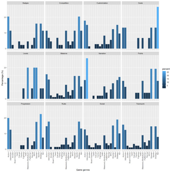Bar chart showing the percentage of appearance of each game genre in each type of gamification element, a lighter color indicates a greater number of appearances.