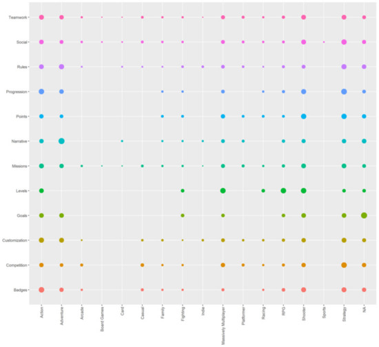 Points graph showing the percentage of appearance of each game genre in each type of gamification element by the size of the point, the color indicates the game genre.