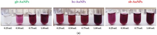 27. Ahmad, T.; Bustam, M.A.; Irfan, M.; Moniruzzaman, M.; Asghar, H.M.A.; Bhattacharjee, S. Effect of volume of gold chloroauric acid on size, shape and stability of biosynthesized AuNPs using aqueous Elaeis guineensis (Oil Palm) leaves extract. Int. J. Automot. Mech. Eng. 2018, 15, 5135–5145. [Google Scholar] [CrossRef]