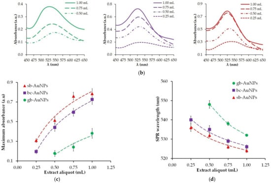 The optical properties of gold sols are characterized by a surface plasmon resonance (SPR) band at 525–560 nm, resulting from collective oscillations of free conduction electrons when excited by an external electromagnetic field. The maximum absorption and wavelength of the characteristic SPR band in the UV–visible spectrum are sensitive to the content of colloidal gold nanoparticles and their size. The shift of the SPR wavelength to the short-wavelength area indicates a decrease in the size of nanoparticles in gold sols [39]. The images of phytosynthesized gold sols and the change in maximum absorption and SPR wavelength resulting from aliquots of strawberry, black currant, and gooseberry extracts are presented in Figure 1. During phytosynthesis, burgundy gold sols are formed, and their color intensity grows with an increase in the aliquot of the extract (Figure 1a). Only in one case phyto-AuNPs are not formed: when the smallest aliquot (0.25 mL) of the gooseberry leaf extract is used and it has the lowest AOA compared with other plants. As illustrated by Figure 1c,d, the highest maximum absorption and shortest SPR wavelength are observed for sb-AuNPs, and the lowest maximum absorption and longest SPR wavelength—for gb-AuNPs. With an increase in the aliquot of plant extracts, there is an increase in maximum absorption (Figure 1c) and a decrease in SPR wavelength (Figure 1d).