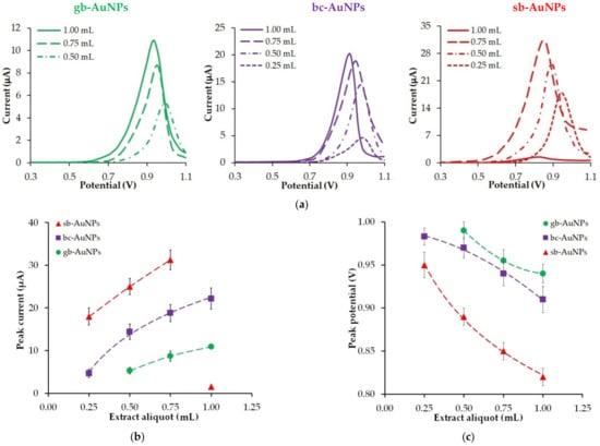 Figure 2. LS voltammograms of phyto-AuNPs electrooxidation (a). Background: 1 M HCl, potential scan rate 0.05 Vs−1. The impact of extract aliquots (pH 6) used in phytosynthesis on the peak current (b) and the peak potential (c) of phyto-AuNPs electro-oxidation. Synthesis conditions of phyto-AuNPs: C(HAuCl4) = 1 mM, Vextr = 0.25−1.00 mL, and pH 6 all of extracts.