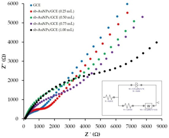 In order to understand why the peak current of sb-AuNPs electro-oxidation falls sharply at a 1 mL aliquot, the electron transport properties of an empty GCE and sb-AuNPs/GCEs were studied with the help of the EIS method. Figure 3 represents the experimental Nyquist plots of the GCE and sb-AuNPs/GCEs. Table 2 demonstrates the results of the EIS spectra fitting using the Randles equivalent circuit. As can be seen from the presented data, modification of the GCE with sb-AuNPs leads to an increase in the semicircle diameter and indicates growth in the interfacial electron-transfer resistance in comparison with the GCE. The larger the aliquot of the neutral extract (pH 6) of strawberry leaves used in the synthesis of gold sols, the larger the semicircle diameter. The highest electron transfer resistance is observed on sb-AuNPs synthesized using a 1.0 mL aliquot. Thus, sb-AuNPs/GCE (1.0 mL) is characterized by almost 10-fold greater charge transfer resistance compared with the GCE (8.4 ± 1.2 vs. 0.87 ± 0.11 kΩ for the GCE) (Table 2), which confirms the lowest electron transfer rate among the discussed sb-AuNPs/GCEs.