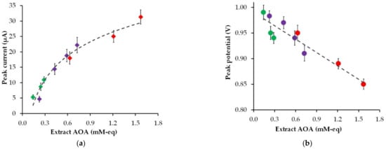 Figure 4. The impact of the AOA of the plant extracts (pH 6) (gooseberry—green marker, black currant—violet marker, and strawberry—red marker) on the peak current (a) and the peak potential (b) of phyto-AuNPs electro-oxidation.