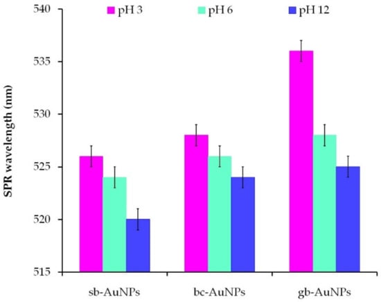 Figure 5. The impact of plant extract pH on the position of the characteristic SPR band of phyto-AuNPs. Synthesis: Vextr = 0.75 mL (for sb-AuNPs) and Vextr = 1.0 mL (for bc-AuNPs and gb-AuNPs).