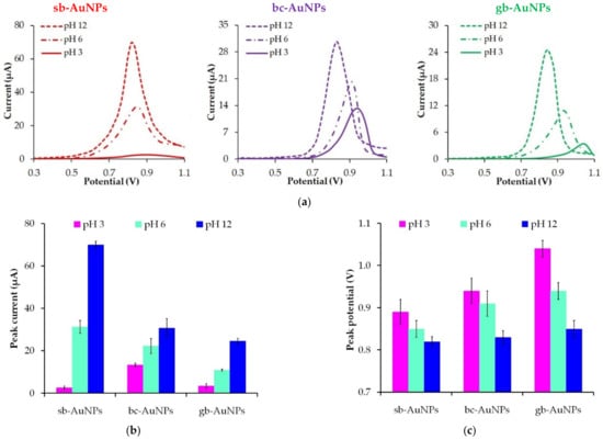 Figure 6. LS voltammograms of phyto-AuNPs electro-oxidation synthesized using plant extracts with different pH (a). Background: 1 M HCl, potential scan rate 0.05 Vs−1. The impact of the plant extract pH on the peak current (b) and the peak potential (c) of phyto-AuNPs electro-oxidation. Synthesis conditions: C(HAuCl4) = 1 mM, Vextr = 0.75 mL (for sb-AuNPs), and Vextr = 1.0 mL (for bc-AuNPs and gb-AuNPs).