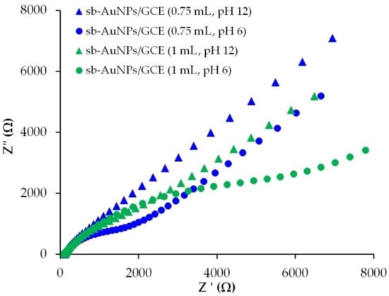 Figure 7 illustrates the Nyquist plots for the GCE, modified with sb-AuNPs that are synthesized with 0.75 and 1.0 mL of alkaline (pH 12) and neutral (pH 6) strawberry leaf extracts. As can be seen from Figure 7, the electron transport properties of sb-AuNPs, synthesized with alkaline and neutral plant extracts, differ significantly from each other. For sb-AuNPs/GCE, whose nanoparticles were formed in an alkaline medium, straight lines are observed on the Nyquist plots. The absence of the semicircle for sb-AuNPs, synthesized with both 0.75 and 1 mL of the alkaline strawberry leaf extract, indicates a significant improvement in electron transport properties compared with nanoparticles synthesized in a neutral medium. It can be assumed that OH ions take an active part in the formation of AuNPs, are embedded in their phyto shell by forming tunnels for electron transfer, and contribute to a lower energy barrier of electron transfer and the removal of the Coulomb blockade for sb-AuNPs (1 mL) [41,42].