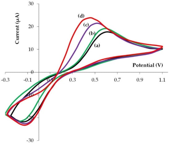 Figure 8. Cyclic voltammograms of 5.0 mM [Fe(CN)6]3−/4− in 0.1 M KCl on GCE (a) and GCE modified with gold nanoparticles obtained by using 1.0 mL extract of gooseberry (b), 1.0 mL extract of black currant (c), and 0.75 mL extract of strawberry (d) leaves. pH of all extracts: 12. Potential scan rate: 0.05 Vs−1.