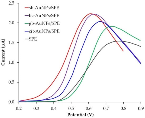 Figure 9. LS voltammograms of 0.1 mM UA on different electrodes in PBS pH 5. Potential scan rate 0.05 V s−1. Synthesis conditions: C(HAuCl4) = 1 mM, Vextr = 0.75 mL (for sb-AuNPs), Vextr = 1.0 mL (for bc-AuNPs and gb-AuNPs), and pH of all extracts: 12.