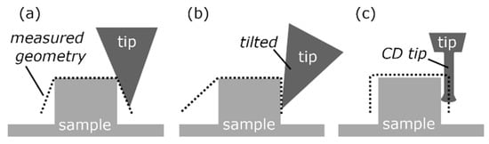 Figure 1c shows that just one measurement is needed for the so-called critical dimension (CD)/two-dimensional (2D) AFM [7]. This CD AFM is specifically designed to measure vertical side walls and is widely used for critical dimension measurements (such as features width, edge profiles, sidewall angles, corner rounding, contours, line edge roughness) and slightly undercut sidewalls for quality assurance in lithography processes and research [8,9]. The probe used in this CD AFM is a cantilever with a conical tip and a cylindrical tip apex. This cylindrical tip apex (diameter 850 nm to 15 nm) is flared at the very end and is known as a CD tip. It has a length-to-diameter ratio of about 6:1 and allows probing in the horizontal and vertical direction by dual-axis tip control. The cantilever bending and torsion, are frequently detected via a dual-optical lever, which makes this CD AFM head a 2D sensor [5,7,8]. The CD AFM and tilting-AFM are oftentimes called three-dimensional (3D) AFMs but have no true 3D-sensing capabilities, mainly because of limitations in cantilever mechanics, which are explained in [10]. Several approaches to, and developments in, true 3D-sensing or true 3D-AFMs have been made [8,9,10,11,12,13,14,15,16,17] with promising results. Unfortunately, most of the systems are still under development.