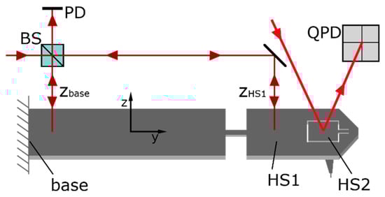 The first head section, HS1, is suspended by the first flexure hinge, FH1; and the second head section, HS2, is suspended by the second flexure hinge, FH2, which is connected to HS1. The tip cone is connected to HS2, and the tip apex is a flared CD tip. The 3D-Nanoprobe is optimized for the quasi-isotropic ratio of the stiffness for the x-, y-, and z-directions. It is also optimized for high sensitivity by reducing the overall stiffness and by adapting it to the CD tip’s mechanical properties along with the separated resonant frequencies and diminished crosstalk, as detailed in [10]. In this paper, the 3D-Nanoprobes tip displacement is detected via an optical detection unit consisting of an interferometer and an optical lever. The optical detection scheme of the 3D-Nanoprobe is shown in Figure 3. A laser beam is split into two beams by the beam splitter (BS). One beam is positioned on the base as a reference arm to reduce drift and environmental influences. The second beam is positioned on HS1 to measure the displacement in the z-direction forming a differential interferometer.