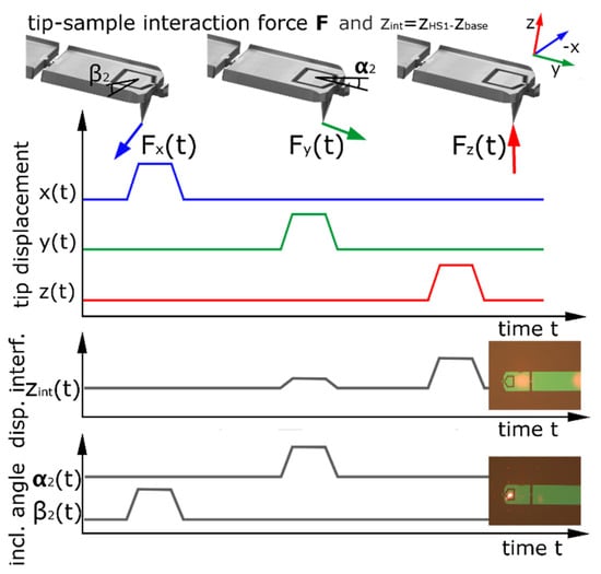 In general, the z-displacement can also be measured on HS2, which has three main advantages compared to HS1: the signal is larger (about two times larger displacement compared to HS1), the z-displacement shows no change in the inclination angle of HS2, as mentioned in [10], and there is only the tip between the sample and the measurement surface. The disadvantage of measuring on HS2 compared to HS1 is a larger displacement in the horizontal x-direction, a larger change in the inclination angle of the surface for horizontal forces, which might influence the collimation of the interferometer beam, and a smaller surface for aligning the beam. In practice, the interferometer spots are currently about 19 µm in diameter. Such a spot is too big for HS2; hence, the second beam is focused on HS1. The laser of the dual-optical lever is aimed at HS2 and reflected onto a quadratic photodiode (QPD) to detect the changing inclination angles and , in orthogonal directions. Figure 4 illustrates the principle of tip displacement and detected signals. The displacement on HS1 is biased by a crosstalk between z and y. With the assumption of a strong correlation between the horizontal CD-tip displacements and the inclination angles of HS1 and HS2, this crosstalk is proportional to the measured bending angles of HS2 and can therefore be compensated for. The change in inclination angle of HS2 will be zero for a specific optimized force direction at the 3D-Nanoprobes tip apex. This force direction denotes the z-direction, as indicated. With a calibration procedure, the three orthogonal displacements of the tip can be selectively detected.