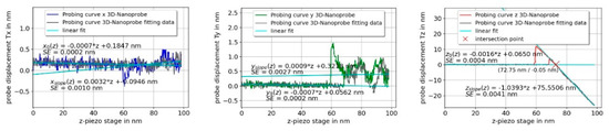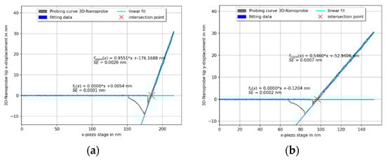Two probing curves with fitted slopes and are shown in Figure 9a,b. For each slope and, an average of five repeated measurements (probing curves) were taken in each spatial direction of the 3D-Nanoprobe.