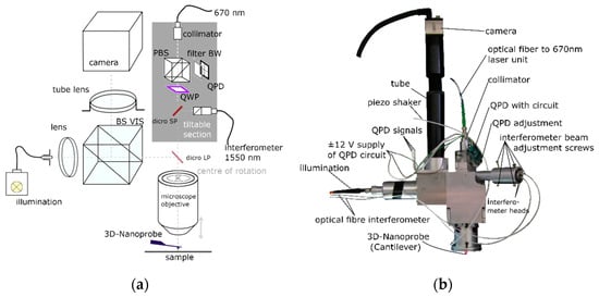 The 3D-Nanoprobe detection unit in Figure 7a consists of two parts, the built is shown in Figure 7b. One part of the detection unit is a dual-optical lever to register bending and torsion angles of an in-focus mounted probe (cantilever or 3D-Nanoprobe). A laser beam is collimated from a self-built superluminescent light emitting diode (SLED) unit with a center wavelength of about 670 nm. It passes a polarizing beam splitter (PBS) and is circular polarized by a quarter wave plate (QWP) rotated at 45°. The beam then passes a dichroic short pass filter (dicro SP) and a dichroic long pass filter (dicro LP), is coupled into the microscope objective, and is focused and aligned on the reflective-coated reverse side of the probe. The reflected laser beam from the probe’s reverse side is collimated by the microscope objective. It then passes the filter dicro LP and dicro SP filters and is linear polarized by the QWP. The linear polarized beam is coupled out by the PBS onto a four-quadrant photodiode detector (QPD). During testing, the SLED beam with 670 nm wavelength used for the optical lever showed a change in polarization passing the dicro SP filter, acting like the built-in QWP. Because of the dicro SP filter properties, the QWP was removed from the setup but has been left in the drawing for more clarity.