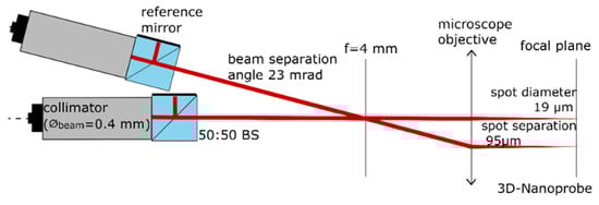 The beam separation of about 95 µm is determined by the distance from the tip region to the base region of the 3D-Nanoprobe. This is achieved by coupling the two interferometer heads into the 3D-AFM head with a beam separation angle of about 1.36° (23 mrad) to each other. The interferometer heads are mounted in an Invar sleeve, which reduced the influence of thermal drift by a factor of about 20 compared to a Duralumin sleeve. The rest of the setup is made from Duralumin. Limited space and distance restrictions lead to a geometry-based offset in the length of optical paths of about 14 mm.