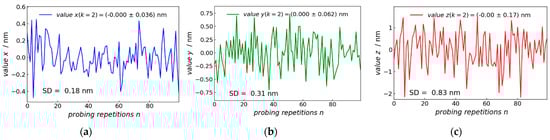 To investigate the probing repeatability of the 3D-Nanoprobe in orthogonal x-, y-, and z-directions, three orthogonal plane surfaces are probed separately. The probing is performed on two IVPS100-PTB type samples [22]. IVPS100-PTB (chip dimension 6 × 6 mm) contained four quadrants with 25 structured and numbered cells and was made of silicon crystal. Each cell contained five parallel lines named as S1, S2, S3, S4, and S5 with a nominal width of about 50, 70, 90, 110, and 130 nm with vertical sidewalls and a pitch of about 500 nm. The sample IVPS100-PTB no. 0301, which is called IVPS0301 in the following, was aligned with the coordinate system of the piezo stage (the coordinate system of the machine) with the lines aligning along the x-axis. The second sample IVPS100-PTB no. 0205 called IVPS0205 in the following, was mounted and rotated by 90 degrees around the vertical z-axis to the IVPS0301. The IVPS0205 aligned with the y-axis. To avoid any bias of the lateral stiffness of the IVPS100-PTB lines in the x- and y-direction, rigid parts of the sidewalls were probed. The 3D-probing capability of the 3D-AFM head was tested with a 3D-Nanoprobe based on CD tip cantilever CDR120 (manufactured by the Nanosensors company) with a probing speed of 1000 nm/s. Figure 10a–c show the probing in the x-, y-, and z-direction, respectively for 100 points. The standard deviations in the x-direction is 0.18 nm, while the y- and z-directions are kept constant, and the standard deviation remains below 0.025 nm and 0.010 nm in the y- and z-direction, respectively. The measurement in the y-direction shows a standard deviation of 0.31 nm, while the standard deviation in the constant x- and z-direction (not shown) are below 0.015 nm and 0.009 nm, respectively. Probing in the z-direction shows a larger standard deviation of 0.83 nm, while the standard deviation of the constant x- and y-direction (not shown) remains below 0.033 nm and 0.023 nm, respectively. The y-direction shows higher values for standard deviation compared to the x-direction, because it is influenced by the interferometer signal as shown in the matrix of Equation (25). The interferometer mainly measures the z-direction of the 3D-Nanoprobe CD tip displacement and has the largest standard deviation because of the interferometer noise. The performance of the interferometer is compromised due to several optical interfaces in the microscope objective, resulting in stray light which causes nonlinearities. Moreover, the interferometer is influenced by ambient environmental conditions. It should be noted that all these measurements are also influenced by the position noise of the piezo stage.