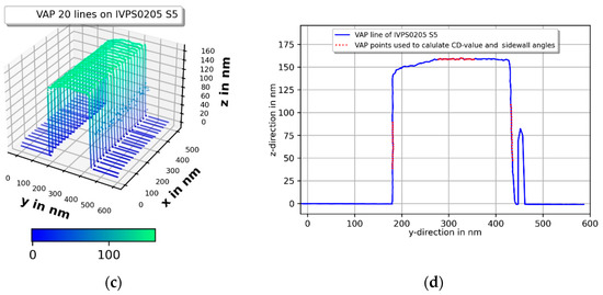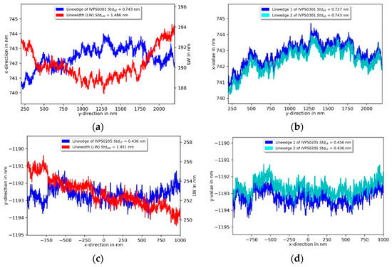 Besides CD values and pitch measurement, the line edge roughness and linewidth roughness are important quantities to be determined for the quality assurance of the manufacturing process. The roughness parameters were determined on the S5 structure of the IVPS0301 and IVPS0205 in the calibrated 2 µm region by probing along the sidewall for a distance of 2 µm with 500 points/µm at a depth of 100 nm. In the left upper part of Figure 16 the measurement of the IVPS0301 shows the left wall line edge roughness standard deviation Sq of 0.75 nm and the corresponding line-width roughness of Sq = 1.49 nm. Two repeated measurements of the left line edge in Figure 16b show very good repeatability of the profile in x-direction. Figure 16c shows the measurements on the IVPS0205 in the y-direction with a left line edge roughness Sq of 0.44 nm and the corresponding linewidth roughness standard deviation of 1.46 nm. Two repeated measurements in Figure 16d of the left line edge also show the very good repeatability of the profile in the y-direction.