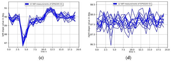 Repetition side wall angle measurements of two orthogonal mounted IVPS100-PTB structures (IVPS0301 (a,c) and IVPS0205 (b,d)). The left side wall angles are shown in (a,c) and the right side wall angles in (b,d) over 20 lines.