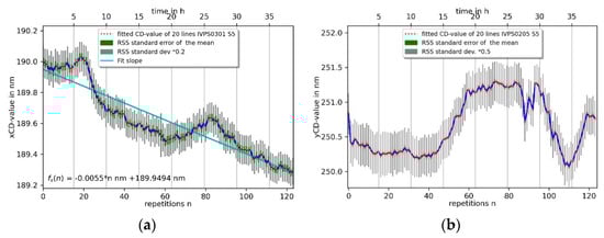 The stability measurements were performed by repeating the same pattern of 20 lines (240 points per line) used for the repeatablity measurement on the same structure, with the same Mustercurve (without VP-line scan), 125 times on the IVPS0301 and IVPS0205. The CD values of the x- and y-direction of the IVPS0301 and IVPS0205 structure are shown in Figure 14a and Figure 14b, respectively. The measurement took about 40 h in total. A single measurement took 18 min and 41 s, resulting in about 5 points/s. The xCD-value of IVPS0301 has a trend of about −5.5 pm per measurement or −0.29 pm per line, which means a small total decrease of 0.7 nm in CD value. The yCD value of the line of IVPS0205 contains stronger fluctuations and shows two distinct peaks which cannot be attributed to a day and night cycle. A trend line fitted for the sake of completeness would have a slope of 4.6 pm per repetition of a single measurement, but does not represent the curve. The better indicator here is the minimum-to-maximum peak value of about 1.2 nm during the stability measurement.