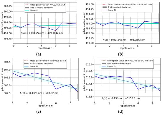 Pitch measurements were performed by alternating measurements of the widest structure, S5, and the next smaller structure, S4, of both IVPS0301 and IVPS0205. The IVPS100-PTB lines have a nominal pitch of about 500 nm. A VP-line scan with a new Mustercurve has been applied for each measurement repetition. The Mustercurve has the same point pattern (240 points) as for the repetition and stability measurements. The pitch measurement in the x-direction in Figure 15a shows very good consistency with a very small increase of 6.6 pm per measurement. The pitch measurement in the y-direction in Figure 16c is biased by the tilted CD-tip and shows a bigger change than in the x-direction of −127.8 pm per measurement. To evaluate this rather big decrease, this pitch measurement was used to evaluate one-side probing on the left side of the line structures. The distance of the left sidewalls of the line structures S4 and S5 show an increase of 1.6 pm and a decrease of −126.9 pm in Figure 15b,d in the x- and y-direction, respectively. This indicates a tip abrasion/wear process on one side of the CD tip in y-direction possibly during the VP-line scan for each individual alternating measurement. This can be reduced by a wear-resistant DLC CD tip and an improved probing strategy of the VP-line scan.