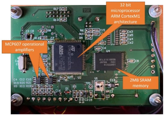 The ARMS functions as follows. The signal from the measuring sensor is fed through the low-pass filter to a voltage follower composed of operational amplifiers. The signal from the voltage repeater is fed directly to the measuring input of the analog-to-digital converter. Each measuring input has a separate, independent transducer. This transducer is an integral part of the microprocessor. This solution enables the measurement of all input signals simultaneously. Signals are measured at 100 kHz in each channel, requiring 10 µs sample spacing. The processed signal value from each channel is stored in an independent buffer with a capacity of 300,000 samples.