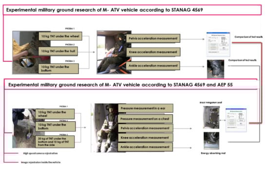 To verify the vehicle’s mine resistance, two sets of field tests were performed. The purpose of the first, conducted at a training ground in Żagań, was to verify the mine resistance of the prototype vehicle and identify the impact of the shock wave on the bottom of the vehicle and the crew. The purpose of the second set of tests, conducted at an artillery training ground in Świętoszów, was to additionally verify the reliability of the protective measures used within the vehicle, such as a specialist blast mitigation seat and an underfoot anti-explosion mat. Moreover, using the developed, prototype test stand, the range of pressure acting on the crew within the vehicle was measured. Figure 3 presents an overview of the experimental research.