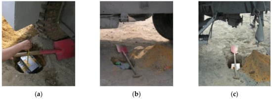 The load of TNT and its distribution during the first tests: (a)10 kg of TNT under the wheel, (b) 10 kg of TN under the center of the hull, (c) and 10 kg of TNT under the reducer.