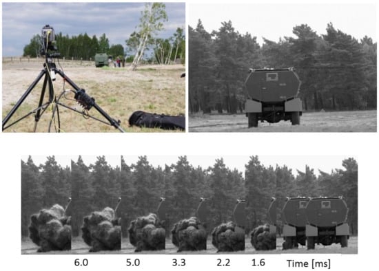 In addition, the blast mitigation seat was verified and the impact of the underfoot explosion mitigation mat on minimizing the overload on the lower limbs was verified. The pressure acting on the crew was measured using the developed test stand and a prototype autonomous measuring apparatus (ARMS). A novel contribution of this work was the introduction of an additional criterion for estimating the level of threat to the crew: the measurement of the pressure acting on the ear. During the experiments, images showing the propagation of the post-blast wave (Figure 5) were recorded using high-speed Phantom v9.1 cameras. In addition, images inside the vehicle during the explosion were recorded, enabling the analysis of the crew kinematics during the explosion.