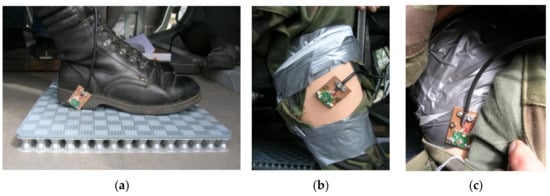 Measurement points on the dummy with attached MEMS accelerometers: (a) feet, (b) lower leg, (c) pelvis.