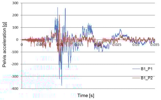 Figure 8 compares pelvis acceleration signals registered without an anti-explosive seat during each of the two explosions: under the wheel, and under the center of the chassis. Each of the two attempts was made using the same amount of explosives. The contrast between the acceleration signals suggests that the highest maximum acceleration impulse was generated by the under-wheel explosion. Figure 9 compares types of pelvis acceleration recorded using the anti-explosive seat during the under-wheel explosion. The comparison between pelvis acceleration signals without (B1_P1) and with (B2_P1) for the use of the anti-explosive seat for the same test parameters and loading mass is presented in Figure 11. The presented results show that the greatest crew overload was registered during the under-heel explosion without the use of the anti-explosive seat.