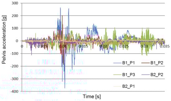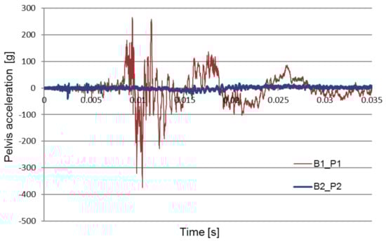 The purpose of the analysis was to determine the time at which the pelvic acceleration impulse occurred. The graphs show that in the tests carried out without the blast mitigation seat the impulse occurs at approximately 0.01 s, while during the tests with the use of the blast mitigation seat these accelerations were reduced to safe values, and the first impulse appears at approximately 0.005 s.