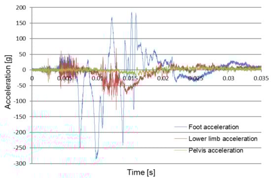 Figure 10 compares the recorded foot, pelvis and lower limb acceleration signals during the 10 kg of TNT explosion under the wheel (B2_P1) with the used blast mitigation seat as well as energy absorption mat under the foot. From the graphs, it can be concluded that for the lower limb (foot and tibia) the times of the first impulse coincide. However, the pelvic acceleration is reduced in comparison and does not show significant change.