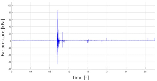 Figure 12 shows an example of the result of the pressure recorded in the ear during the detonation of 10 kg of TNT under the wheel of the vehicle (B2_P1). The attachment point of the KS-375M-100G pressure sensor is shown in Figure 6.