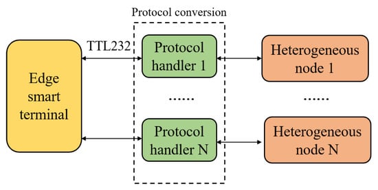 Figure 4 shows the heterogeneous nodes networking framework. The edge intelligent terminal uses a unified TTL232 interface to communicate with various heterogeneous network nodes. Since the communication interfaces of heterogeneous nodes are different, a coprocessor is introduced into the network to bridge the edge intelligent terminal, and various heterogeneous nodes complete the information exchange with the intelligent terminal through the coprocessor. For an example, a Bluetooth module is introduced for data collection at first, such as temperature data, and then these data are transmitted to the corresponding coordinators. Second, these coordinators transmit the data to coprocessors through the corresponding communication interface, such as SPI, IIC, etc. Finally, the coprocessors transmit the data to the intelligent terminal through a unified interface.
