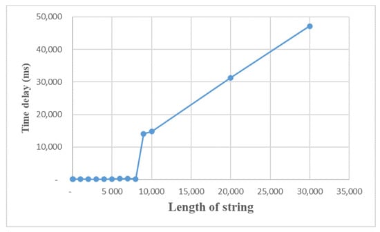 We test the message transmission effect with two XMPP accounts, as shown in Figure 14, and find that the delay is almost the same when the length of the string is below 8130, between 100 to 300 ms, and the sending time increases steeply to more than 14 s when the length exceeds 8130, and the delay is positively correlated with the length of the sent string.