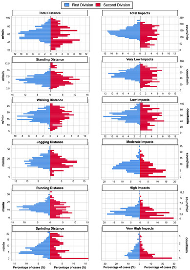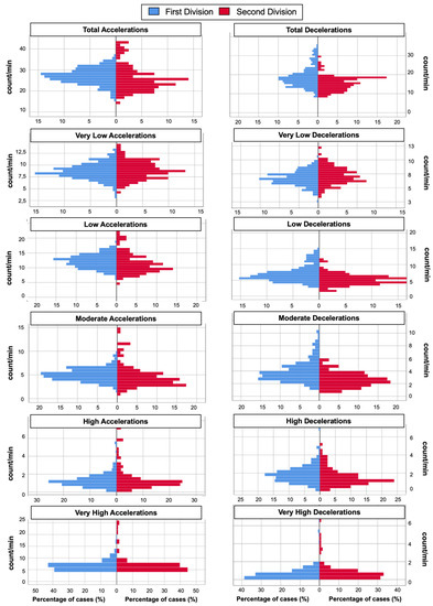 Figure 1 and Figure 2 show the histograms on the variables related to distance and impacts, and accelerations and decelerations, respectively. The results are similar in both teams analyzed, although the first division team presents a greater number of high intensity actions than the second division team.