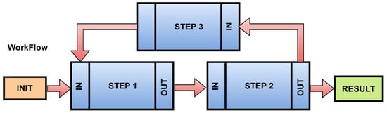 A workflow that can be assembled from the steps to be performed consists of basic parts as shown in Figure 11. The communication between steps is indicated by arrows.