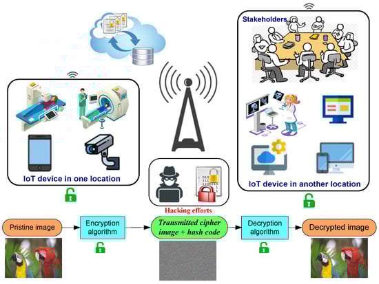 Developments in the Internet of Things (IoT), cloud computing, and fifth-generation network technologies make multimedia data easy to share with various users for specific purposes. In this context, the sharing of multimedia data suffers from serious security issues [,,,]. Multimedia data can be secured via executing one of the protection techniques: information hiding and data encryption mechanisms. Encryption techniques aim to transform multimedia data from an understood pattern to an incomprehensible form. Recently, chaos systems have played an important role in designing robust multimedia data encryption mechanisms and secure communication.