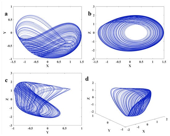 The chaotic dynamics of Equation (1) with and in (a) ; (b) ; (c) ; (d) .